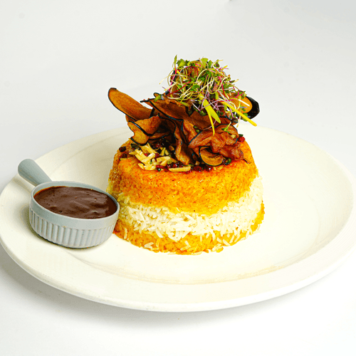 ته چین،گوشت ماهیچه گوساله،چیپس بادمجان،سس مخصوص