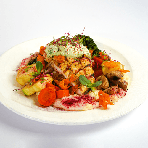 سینه مرغ گریل شده ، پوره سیب زمینی ، سبزیجات ، سس پیازچه