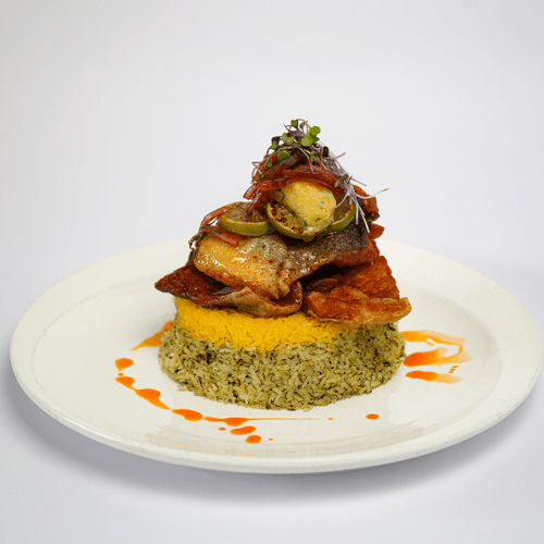 برنج ایرانی، سیر، سبزی، ماهی قزل آلا سرخ شده