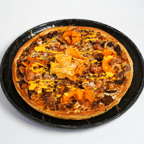 خمیر پیتزا، سس هات بین، قارچ، پولد بیف، اوریگانو، سس چدار، تردیلا، چیپس هویج، پلبیبر