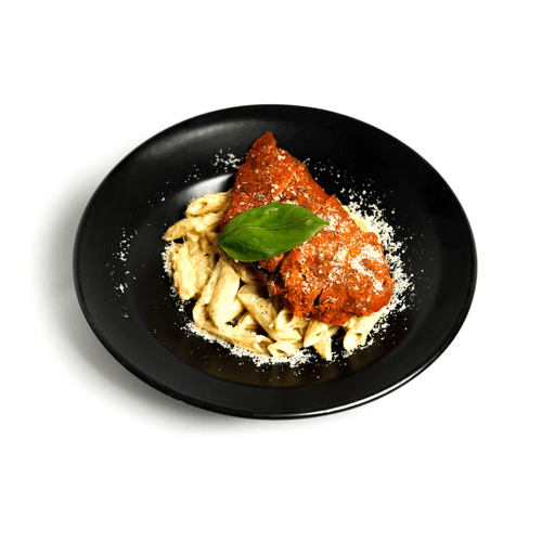 پنه، سس آلفردو، شنیسل مرغ سوخاری، پنیر پارمسان، ریحان ایتالیایی