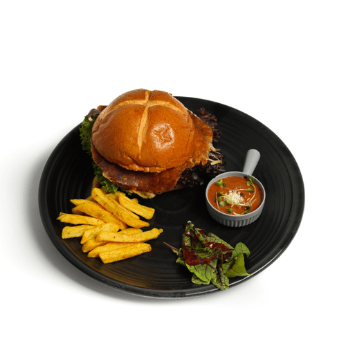 برگر150گرمی، پنیر گودا، کاهو لوتوس، گوجه فرنگی، خیار، سس مخصوص، ساید سالاد و سیب زمینی(سرو سالن)