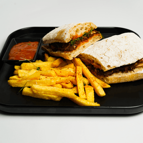 پولد بیف، قارچ، سس چری دنی گلس ، سیب زمینی، نان چیاباتا، روکولا، سس کوکتل