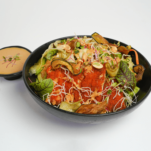 کاهو،سینه مرغ سوخاری،هویج اسپاگتی،سس پینات باتر(تند)، بادام زمینی،کلم بنفش،پیازچه،گشنیز تازه،خیار،بیبی اسفناج،چیپس بادمجان،میکروگرین، رایس نودل