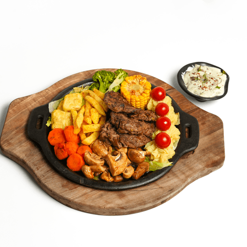 پوره سیب زمینی،دورچین سبزیجات،سس قارچ،فیله گوساله سروشده در ظرف چدن