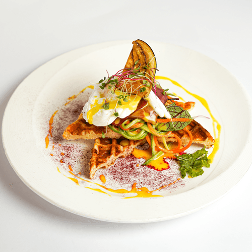 وافل، بیکن، سالاد روکولا، تخم مرغ، سس مخصوص