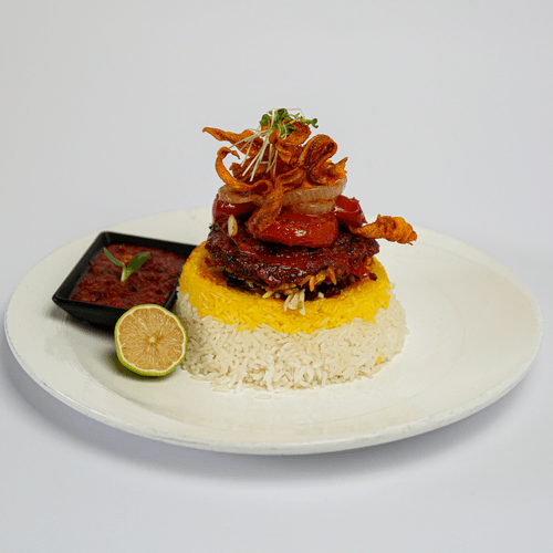 کته، گوشت گوساله، سس گوجه، چیپس هویج به همراه سس مخصوص