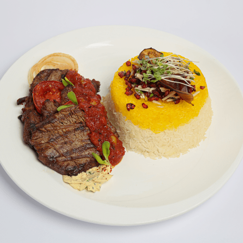 فیله گوساله با برنج ایرانی ، گوجه فرنگی، سس سماق، پیاز کبابی، ساید سالاد