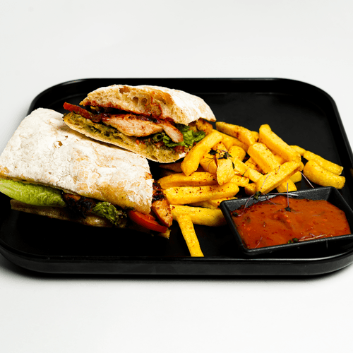سینه مرغ گریل، نان چیاباتا، سس زرشک، سس اسفناج، کاهو فرانسه، گوجه فرنگی، سیب زمینی
