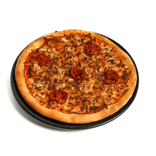 فیله مرغ، قارچ، گردو، سس پستوروی پیتزا، موتزارلا، دیپ پنیر، سس گوجه، پارمسان