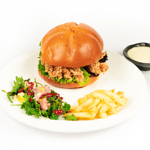 نان برگر ،2عدد فیله سوخاری ،سس مخصوص،کاهو لوتوس،گوجه فرنگی،رلیش خیار، ساید سالاد و سیب زمینی(سرو سالن)