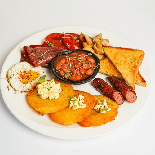 نیمرو،سوسیس،بیکن،هش براون، گوجه کبابی،قارچ کبابی،خوراک لوبیا و سالاد