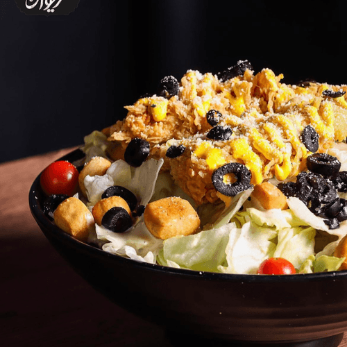 کاهـــو رســـمی و پیچ/گوجـــه گیلاســـی/زیتون/نان کروتان/پنیـــر پارمزان/همراه با سس سزار..lettuce/tomato/olive/crotan bread/parmesan cheese/ Caesar sauce