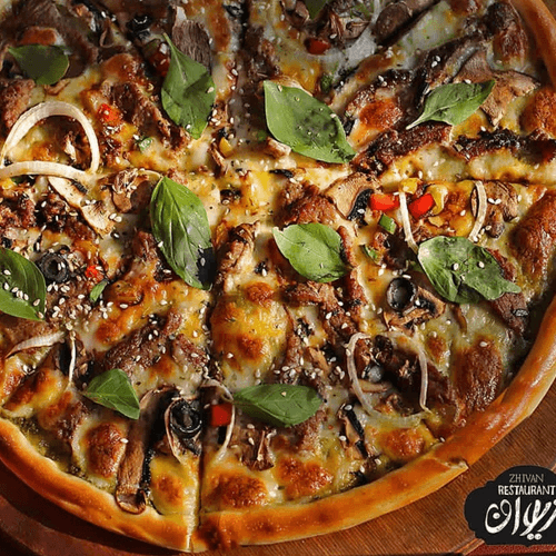 پنیـــر/فیلـــه گوســـاله/پیاز/فلفل دلمـــه ای/سس پستو/ریحان..cheese/veal fillet/onion/sweet pepper/olive/pesto sauce/basil