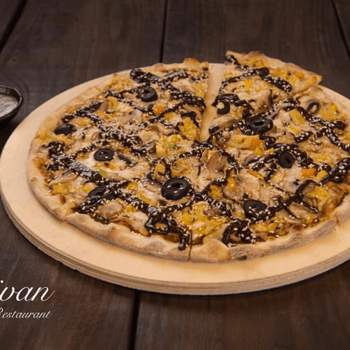 پنیر/فیلـــه مـــرغ گریـــل شـــده طعـــم دار تند/قارچ/فلفل دلمه ای /ارگانو/سس بار بیکیو..cheese/hot chicken fillet grilled/mushroom/sweet pepper/organo/Bar.B.Q sauce