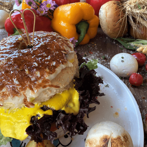 گوشـــت خالـــص / پنیـــر گودا/پنیـــر کاراملی/گوجه/خیارشور/ کاهو/سیب زمینی سرخ شده..pure meat/gouda cheese/ caramely cheese/tomato/pickled cucumber/lettuce/french fries