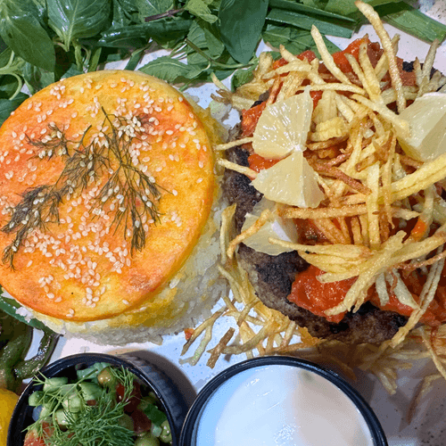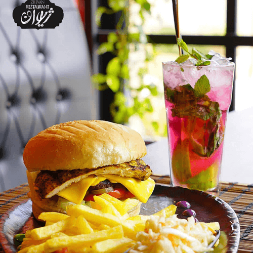 گوشـــت خالص/فیلـــه مـــرغ گریـــل شـــده/پنیر گودا/گوجه/خیارشور/کاهو/سیب زمینی سرخ شده..pure meat/grilled chicken fillet/gouda cheese/tomato/pickled cucumber/lettuce/french fries