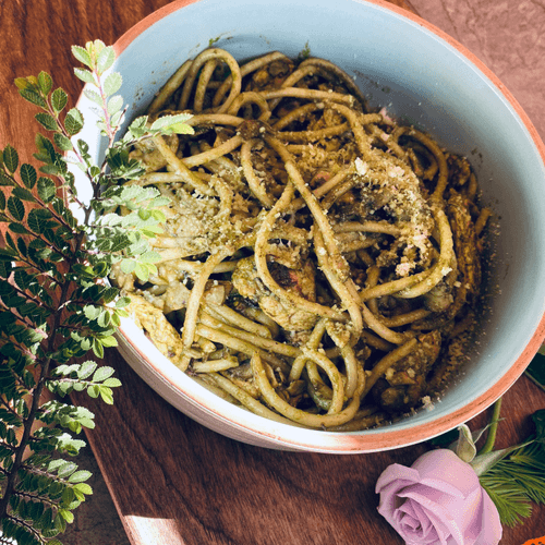 فیله مرغ/اسپاگتی/سس پستو/قارچ/پنیرپارمزان.. chicken fillet/spaghetti/pesto sauce/parmesan cheese/mushroom