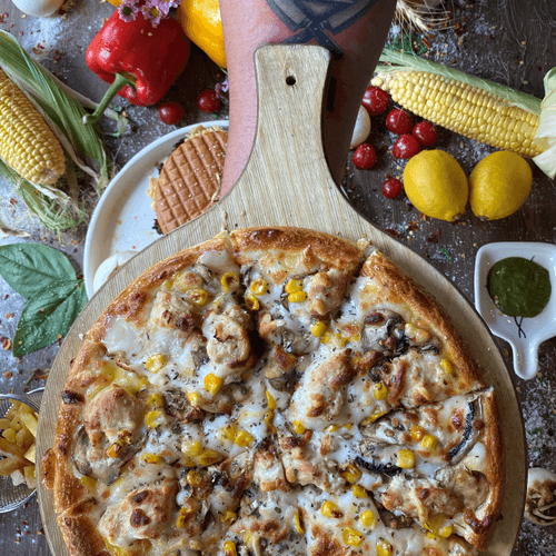 پنیر/مرغ مزه دار شده با خامه/قارچ/ارگانو/ذرت..cheese/chicken with cream/mushroom/organo/corn