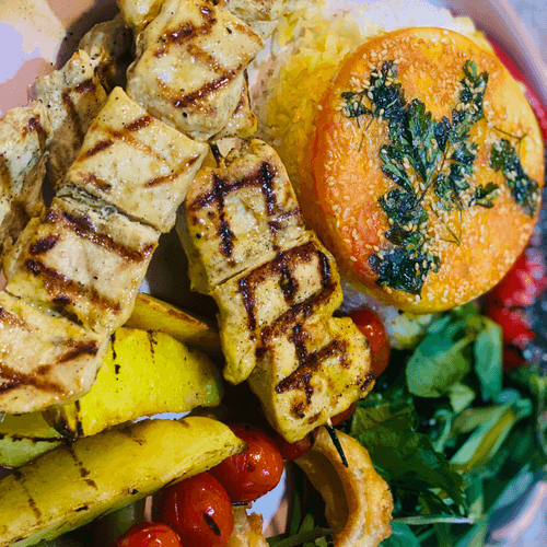 ٣ سیخ جوجه کباب/زیتون /سالاد شیرازی/ماست/سبزی خوردن/گوجه کبابی..chicken kebab/shirazi salad/yogurt/vegetable/p/tomato