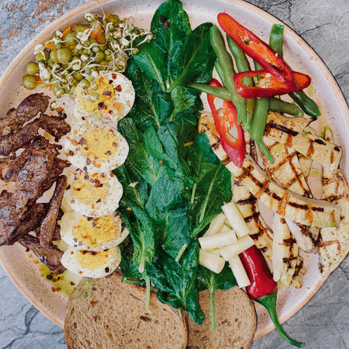 گوشت گوساله،فیله مرغ،بی بی اسفناج،سبزیجات روز،سیب زمینی تنوری،تخم مرغ آب پز،قارچ،سس مخصوص ژیوان..veal/chicken fillet/baby spinach/vegetable/roast potatoes/boiled egg/mushrom/ special Zhivan sauce